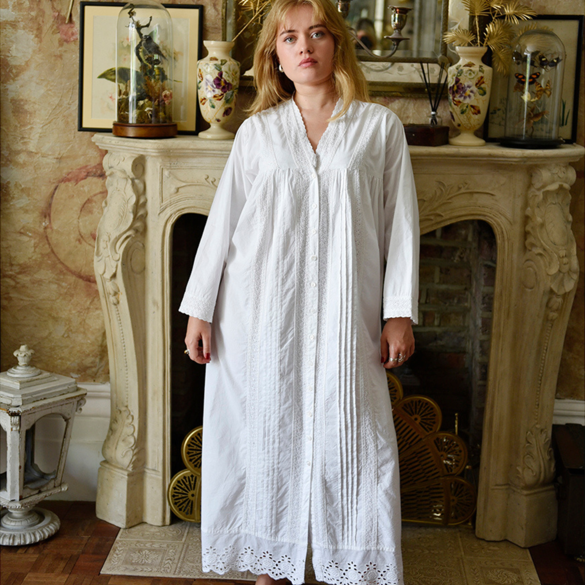 Our Harriet pyjamas tick all the boxes! The neat mandarin collar leads to pretty pleated detail on the front, nipping in at the waist to create a flattering silhouette. Mother of pearl buttons run down the centre of the top and the three-quarter length sleeves add an elegant detail. Trousers are full-length with an elasticated and tie waist, all woven in 100% pure white cotton.