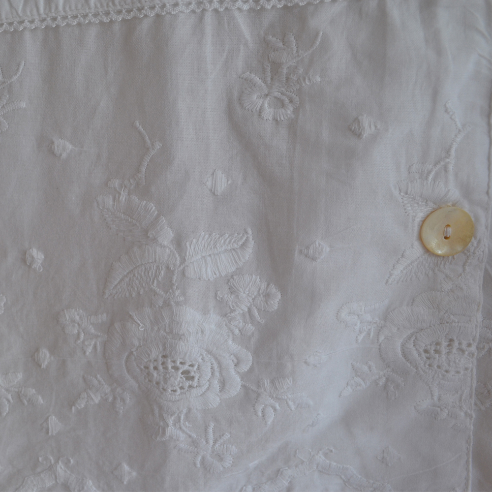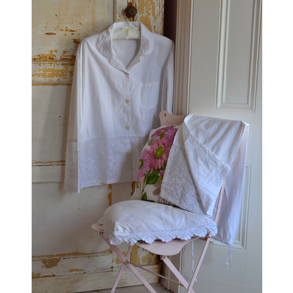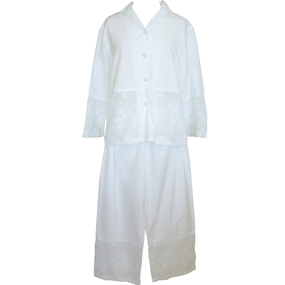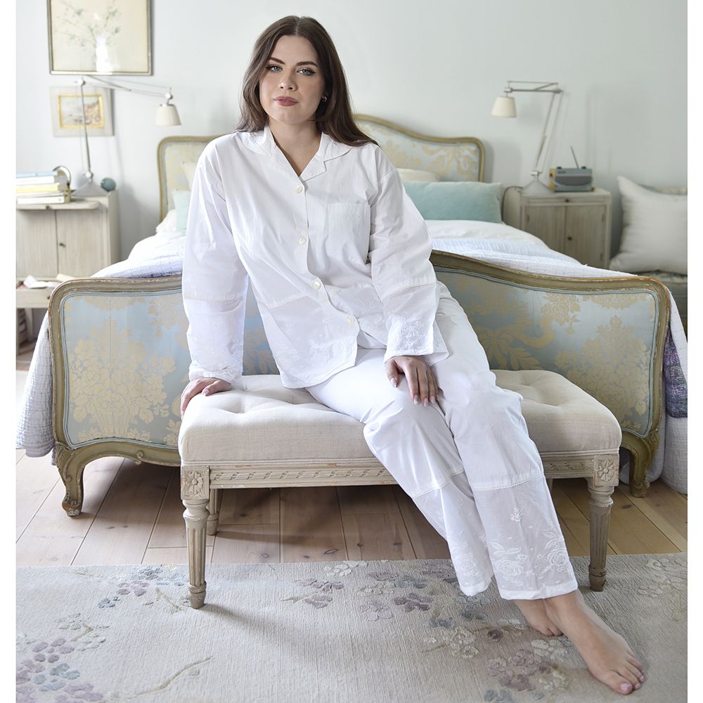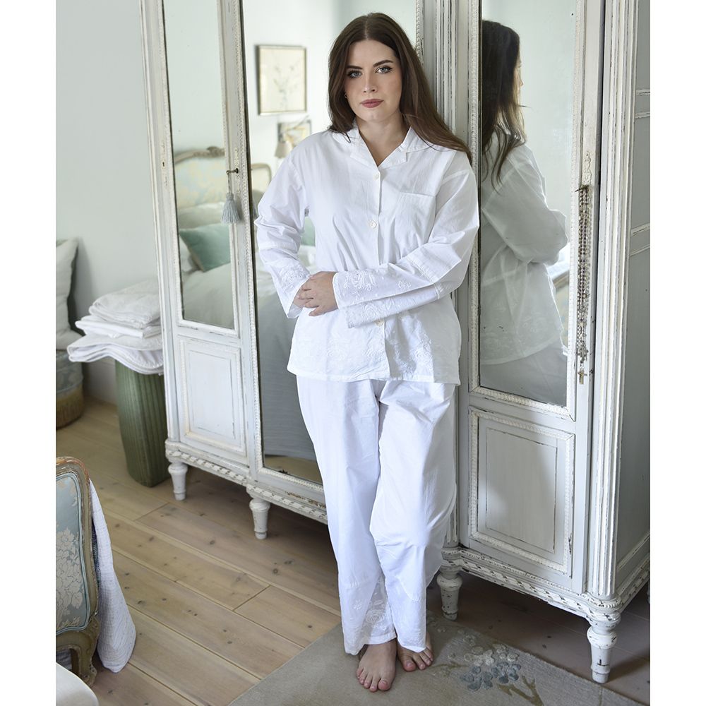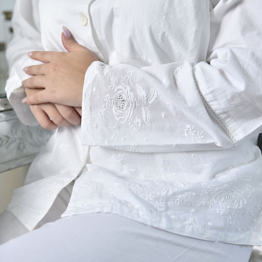 Elegant white cotton pyjamas are highly praised by our customers for their quality and beautiful finish. The button-through jacket top has one pocket on the chest and embroidered rose motifs on the rounded collars. The sleeves, bottom of the jacket and the hems of the loose drawstring trousers have a deep panel of exquisite white embroidered roses and leaves.