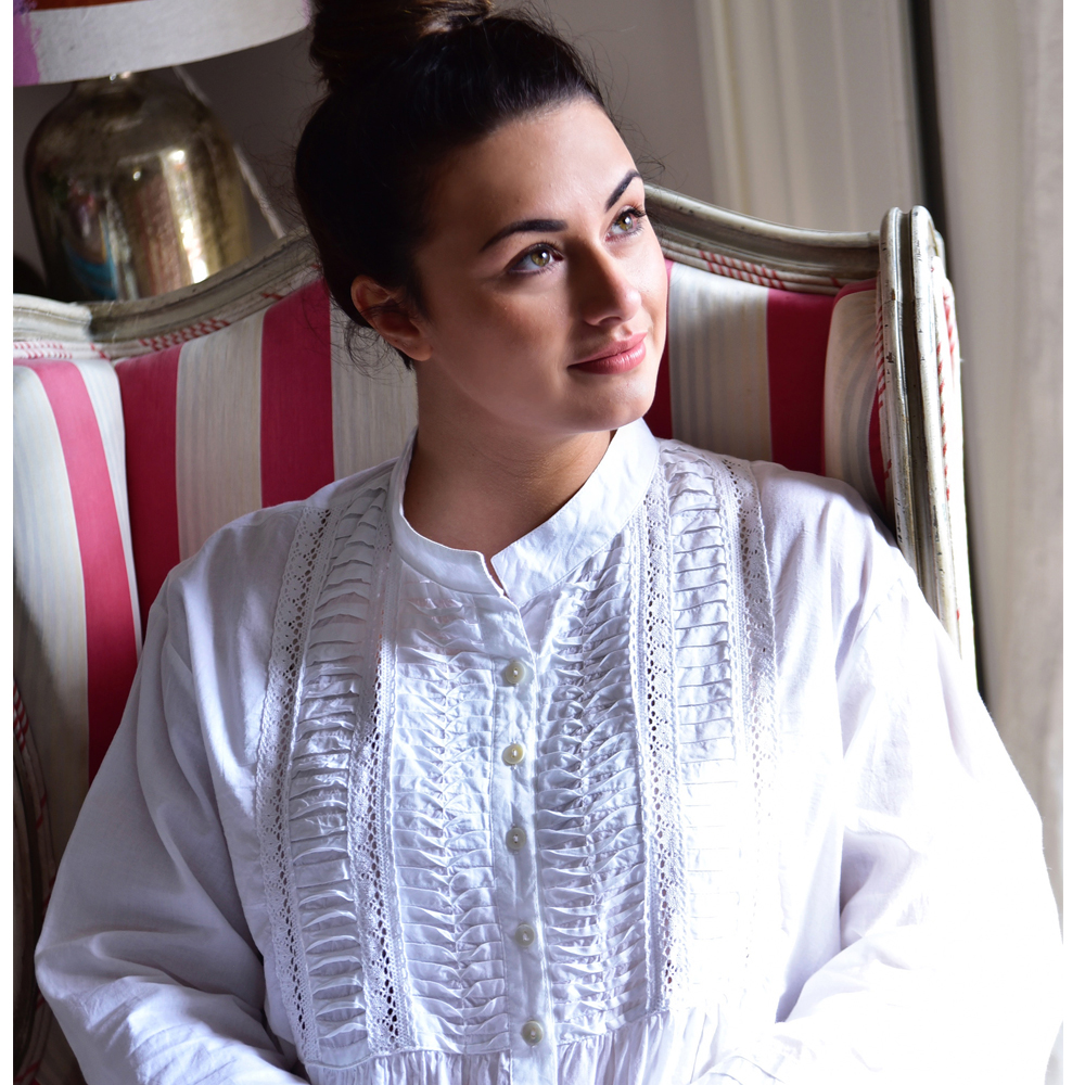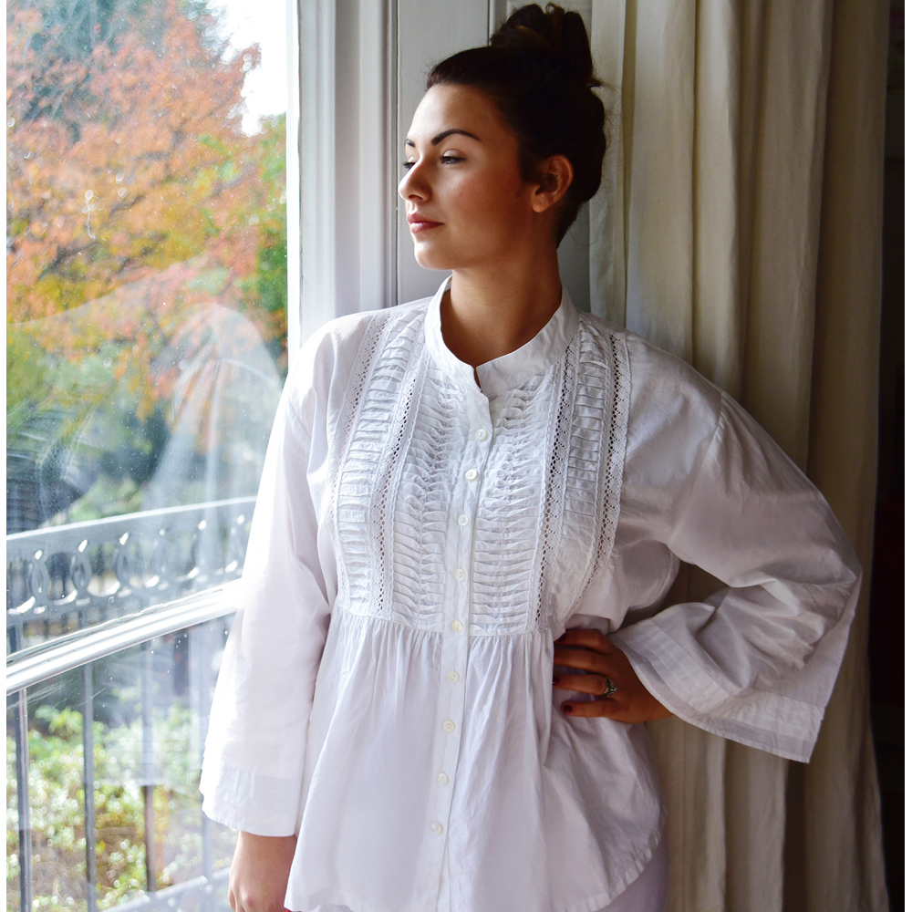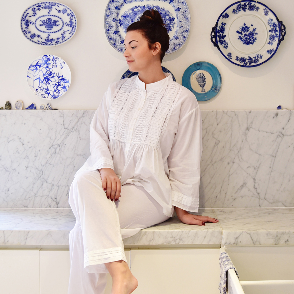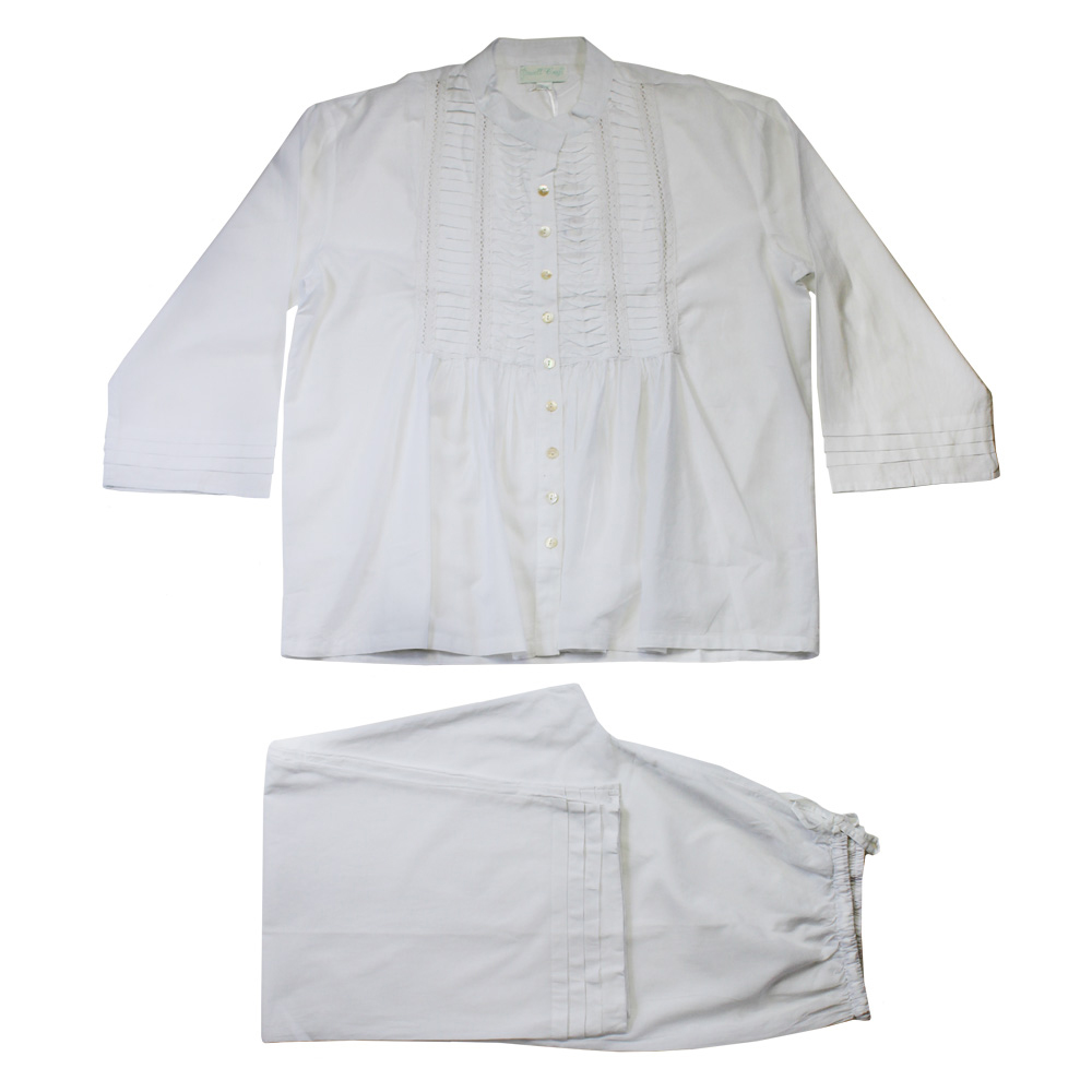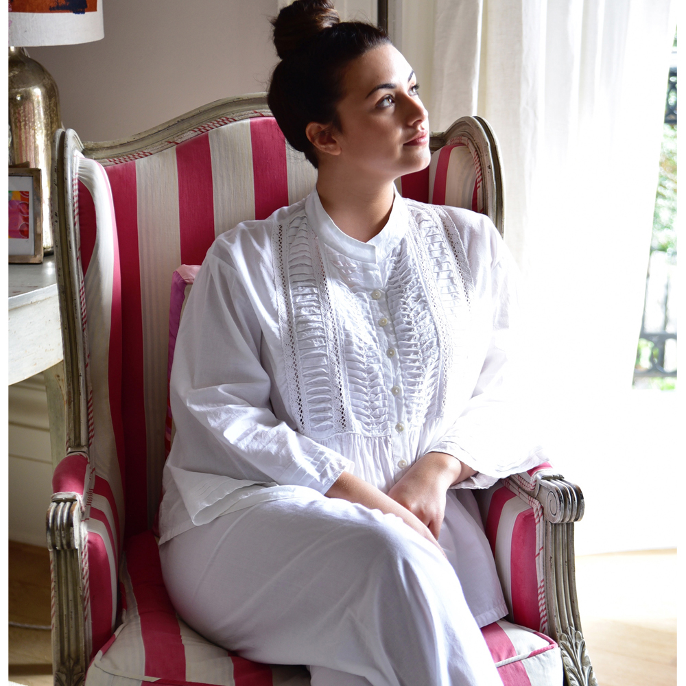 Our Harriet pyjamas tick all the boxes! The neat mandarin collar leads to pretty pleated detail on the front, nipping in at the waist to create a flattering silhouette. Mother of pearl buttons run down the centre of the top and the three-quarter length sleeves add an elegant detail. Trousers are full-length with an elasticated and tie waist, all woven in 100% pure white cotton.