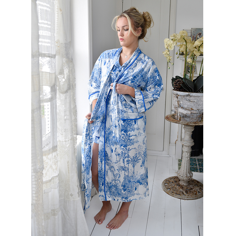Our printed dressing gowns are made from beautiful cotton – ideal for all year round. Elegant and easy to wear, the wraparound style fits all sizes from 8 to 16 (making them an ideal gift!). They look perfect worn over our matching pyjamas but are equally stylish paired with one of our white cotton nightdresses.