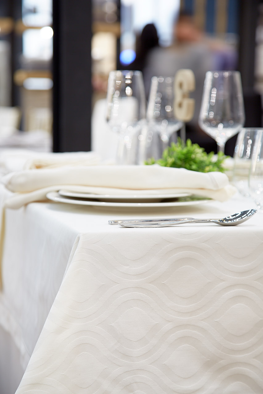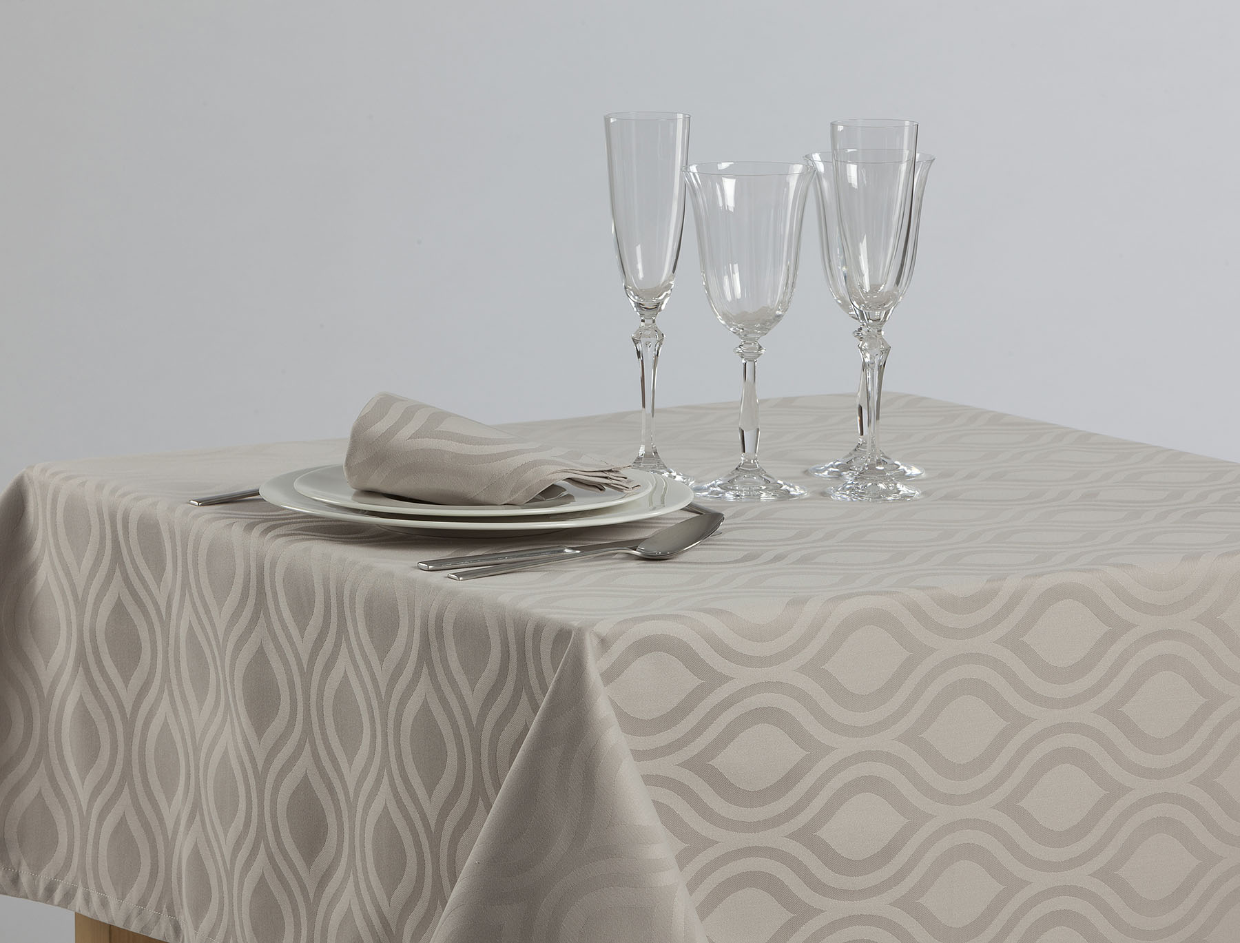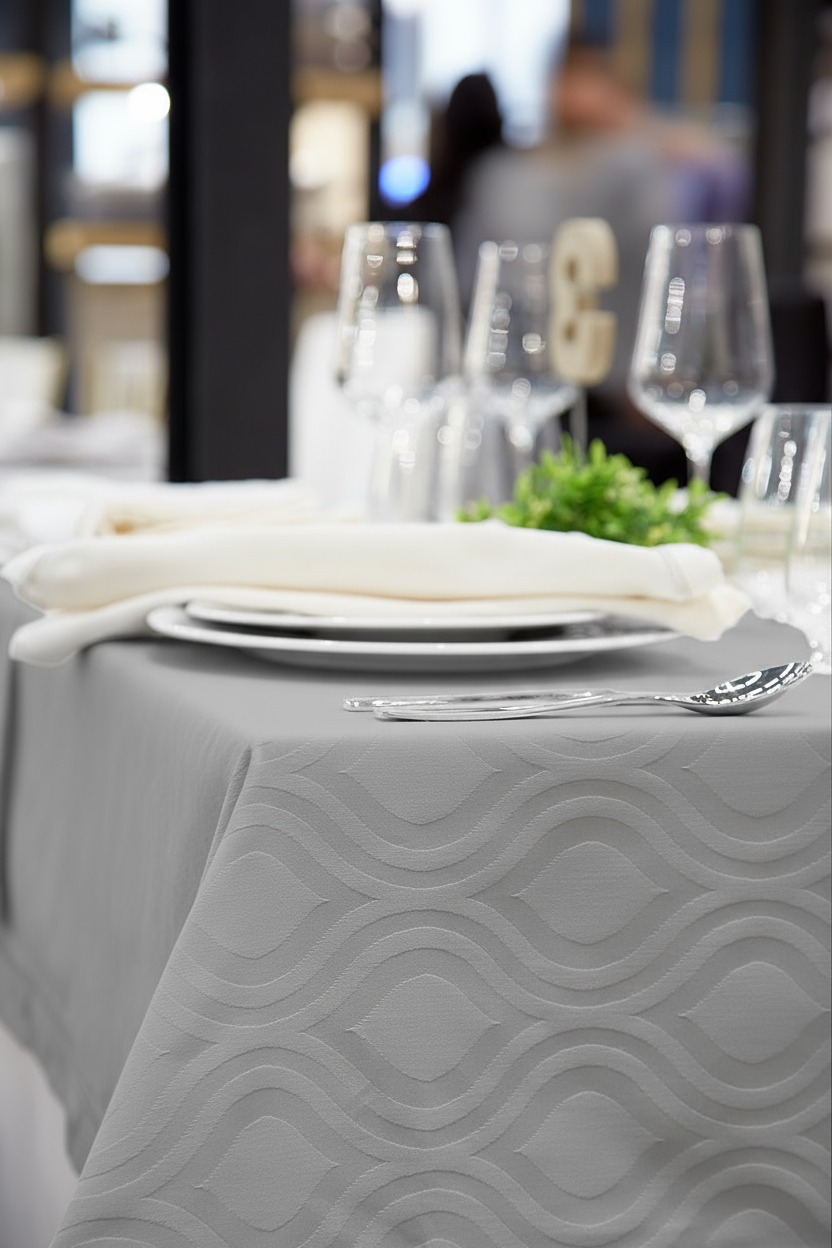 Coleman tablecloth with a tone on tone repeating geometric pattern, This type of elegant, often seamless, fabric tablecloth is commonly used for formal dining, events, and weddings.