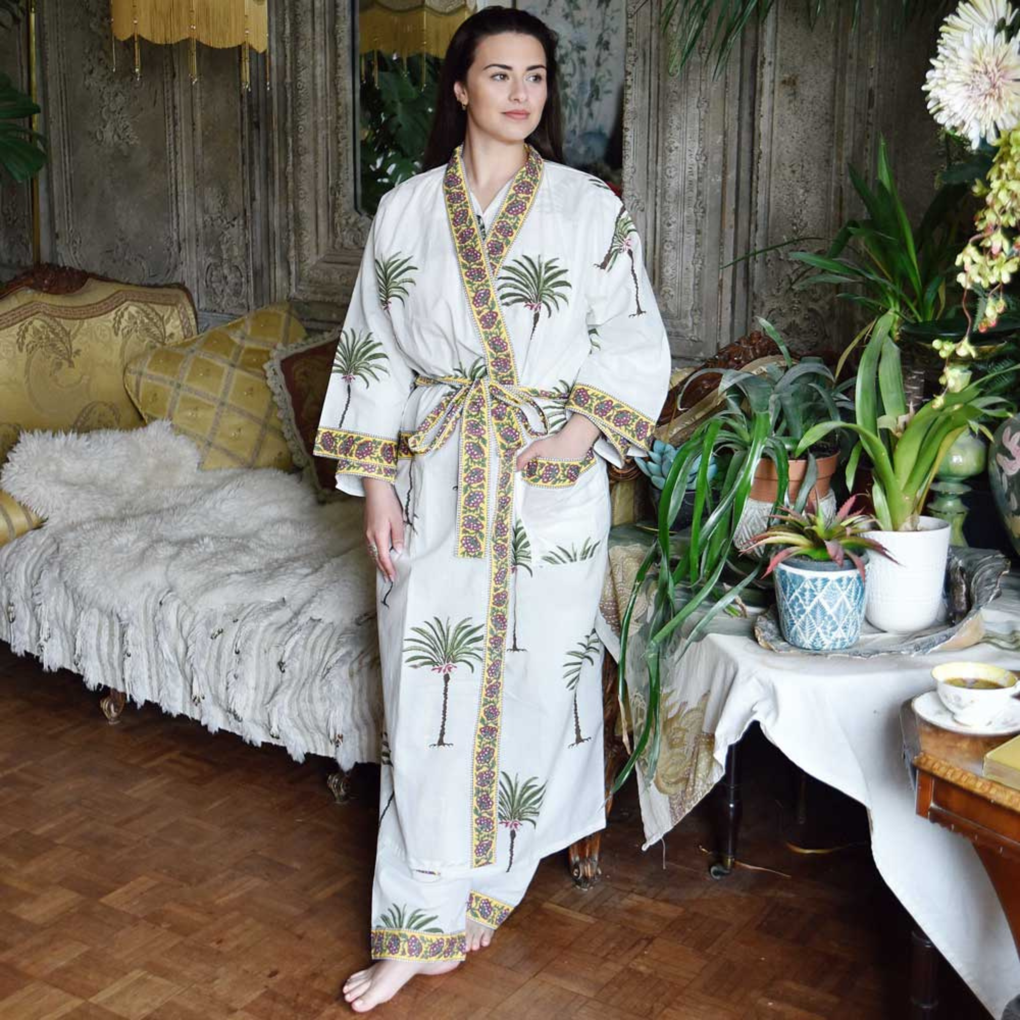 This zingy dressing gown in so bright and fun – A fresh lime green background makes the repeated pink flower block print pattern on the fabric really pop. The open front, cuffs, and pockets are trimmed in a complimentary pink which has a dark pink and lime green floral design. The dressing gown fastens with a long tie belt.