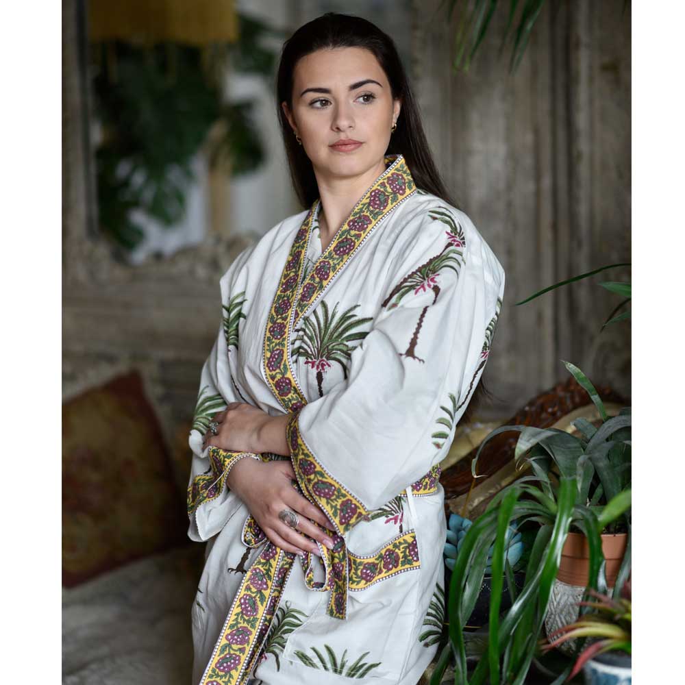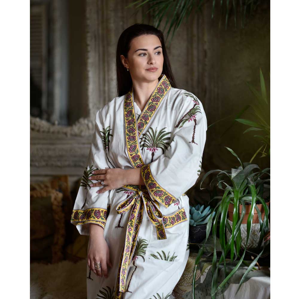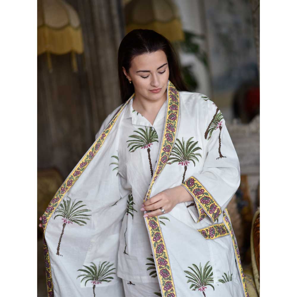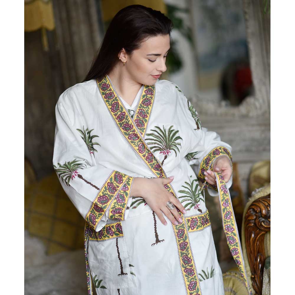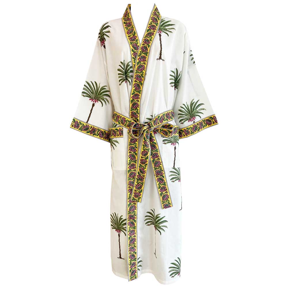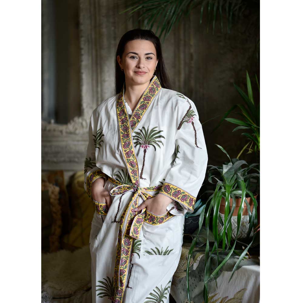 Our exotic palm tree print is an elegant choice – a white background with large-scale trees with brown trunks, a crown of green fronds, and maroon fruit. The colours of the print are complemented by the contrasting printed warm yellow trim with maroon flowers on the cuffs, open front, top of the pockets and the long waist tie.